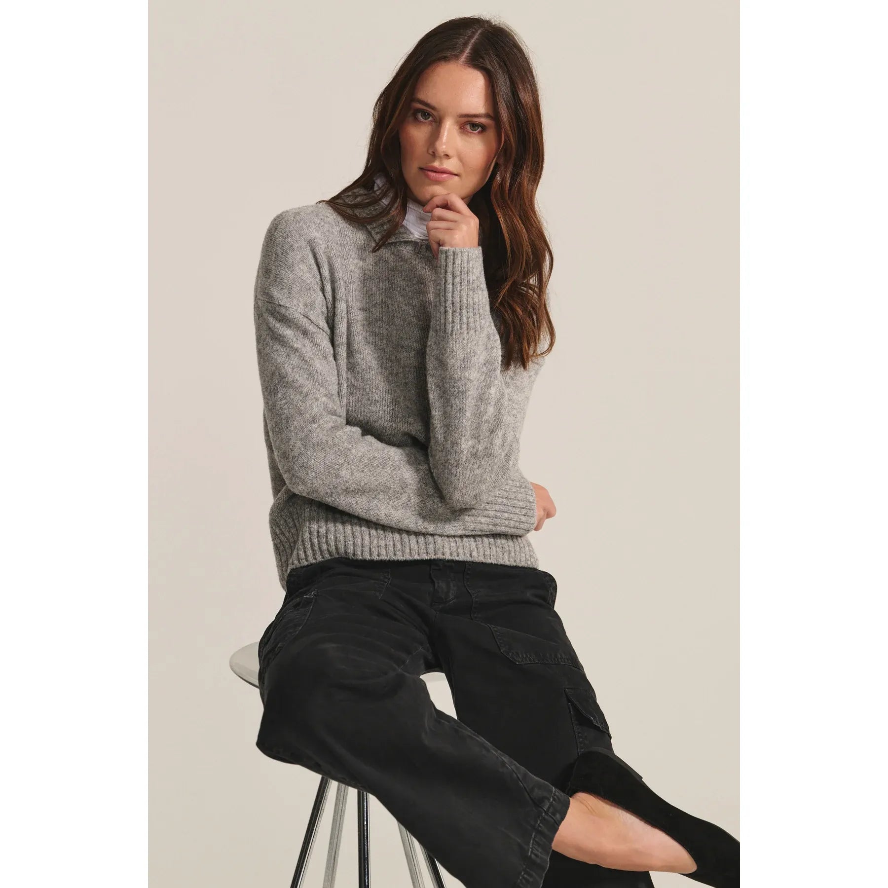 Crafted from a soft wool blend, this slightly cropped sweater features a fold-over collar, wide ribbed trims, and heathered coloring for rich texture and depth. Style it with a white mock neck or layer a simple tee underneath for added warmth and an effortless layered look.